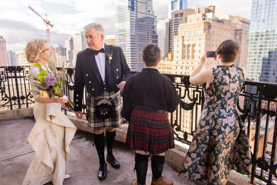 Sara Jane and Alan came to us with a sentimental and unique vision for their wedding flowers: Outlander meets The Great Gatsby. The groom is from Scotland and the couple wanted to honor his homeland with stems like thistle and heather, while keeping the arrangements modern and sculptural to fit the art nouveau aesthetic of The Bellevue Hotel. Alan wore traditional full kilt regalia and Sara Jane wore the most beautiful structured gown. Sara Jane’s bouquet was a more upright style then we typically do with longer stems. We loved stepping outside of our normal design shapes on this event!