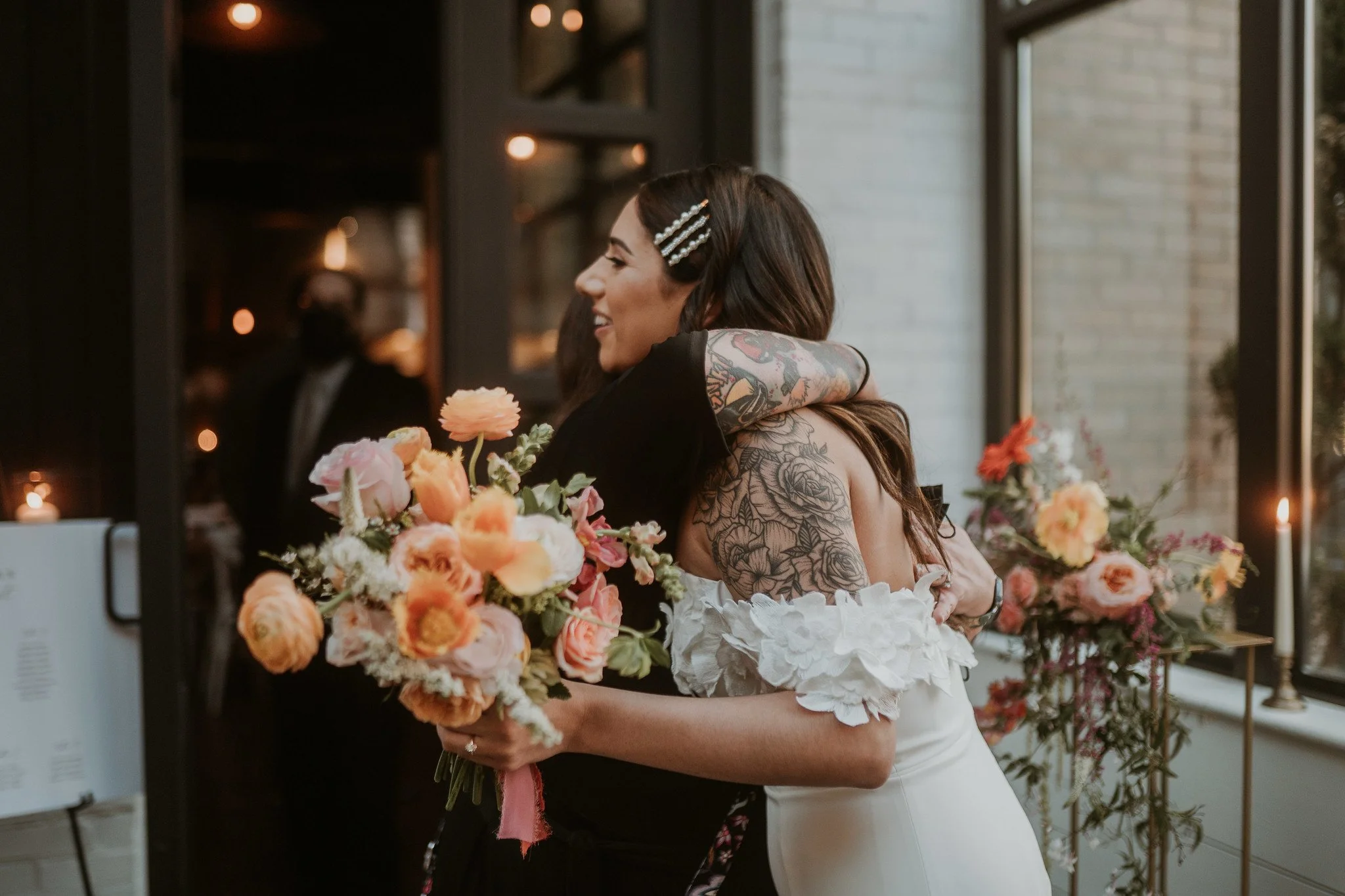 Their wedding was April 8, so they got the best of Spring flowers––fluffy ranunculus, frilly tulips and funky hellebore filled their palette of oranges and pinks.